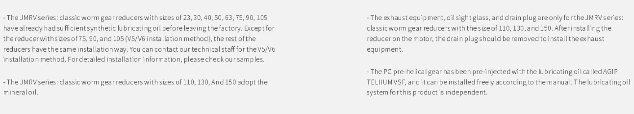 4.At the beginning of use, there might be a problem related to the lubricating oil since the viscosity of the new lubricating oil is relatively high. As a result, operating the reducer for a few minutes under the no-load condition before starting to load is recommended. The replacement of the lubricating oil should be after the first-time use of 10,000 hours, but it also depends on the specific working environment. As for the reducer without the oil fill hole, there is no need to change the lubricating oil。
