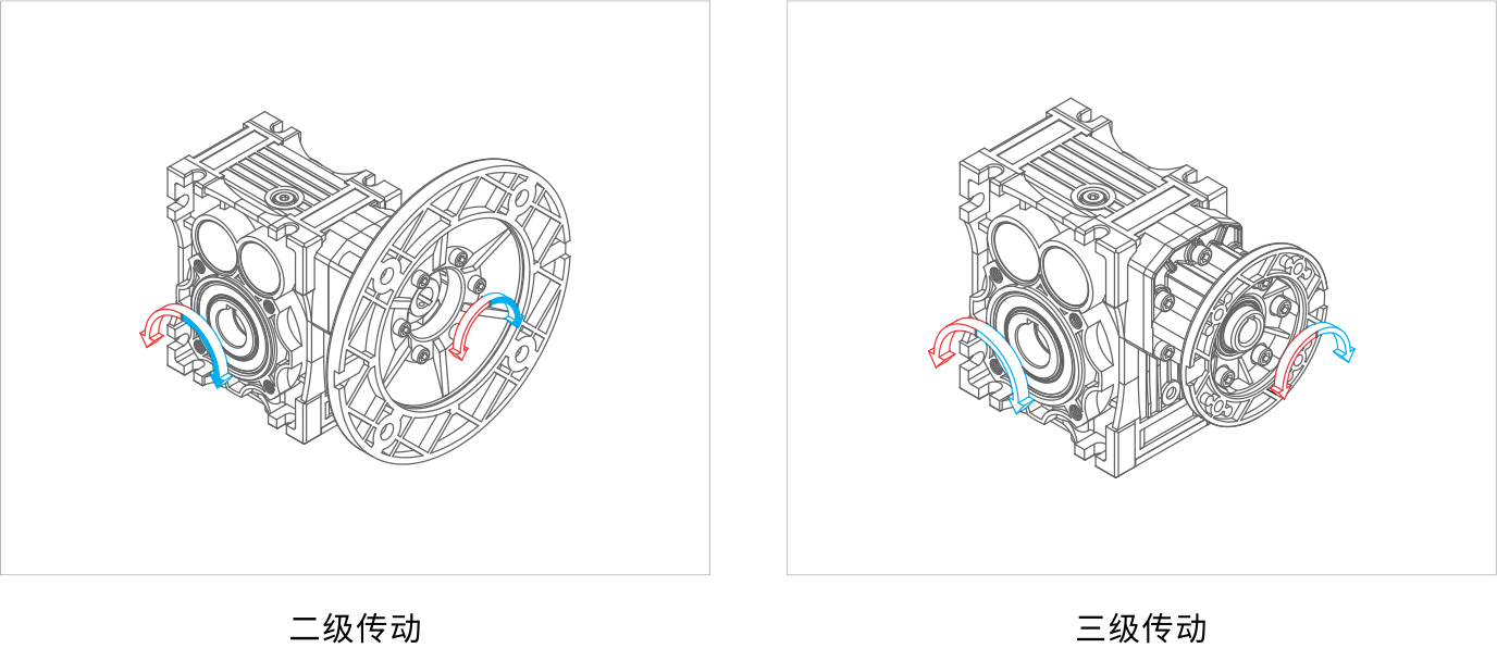 速比7.5~60采用二級(jí) 傳動(dòng),速比80~300采用三級(jí)傳動(dòng)。