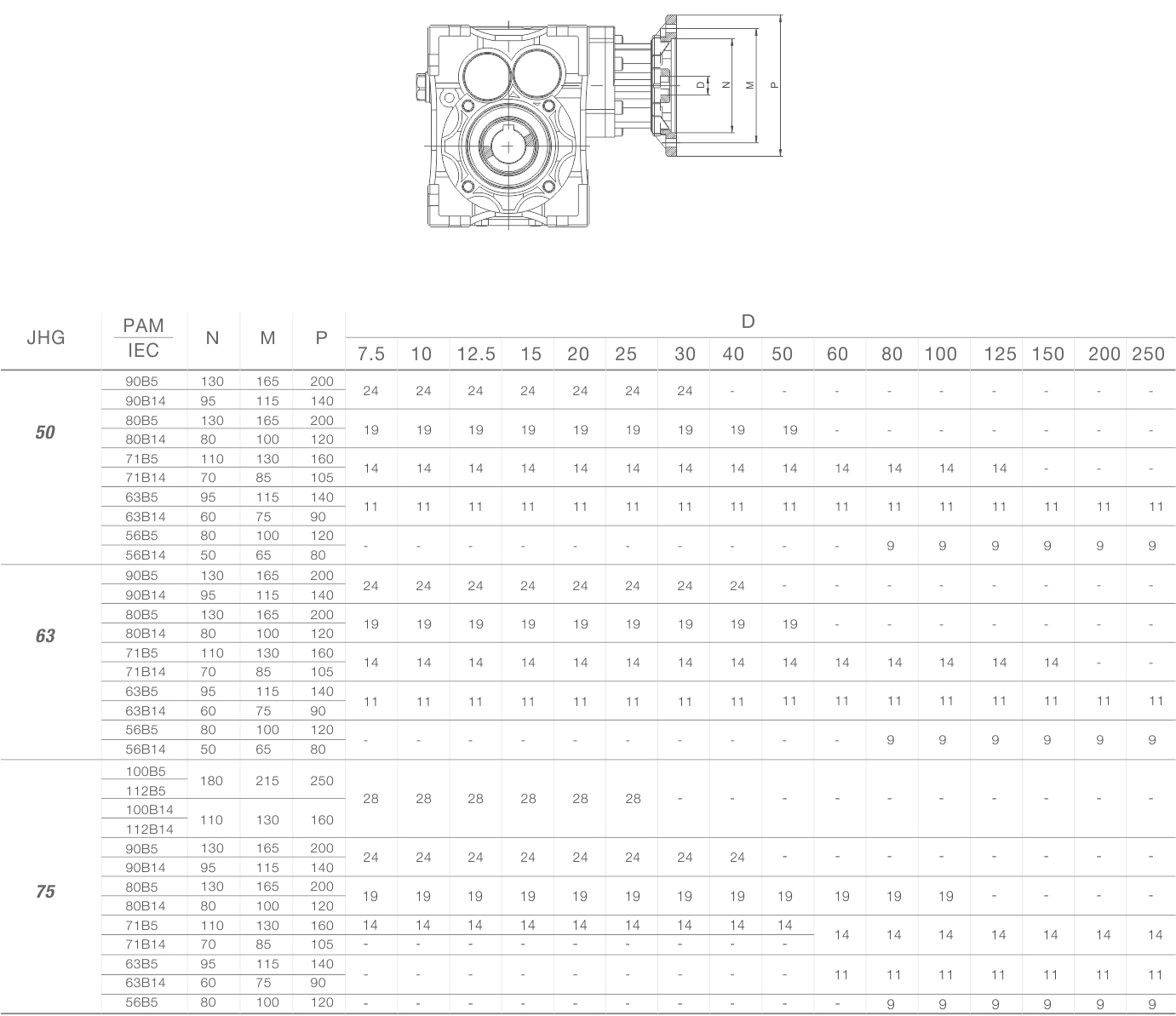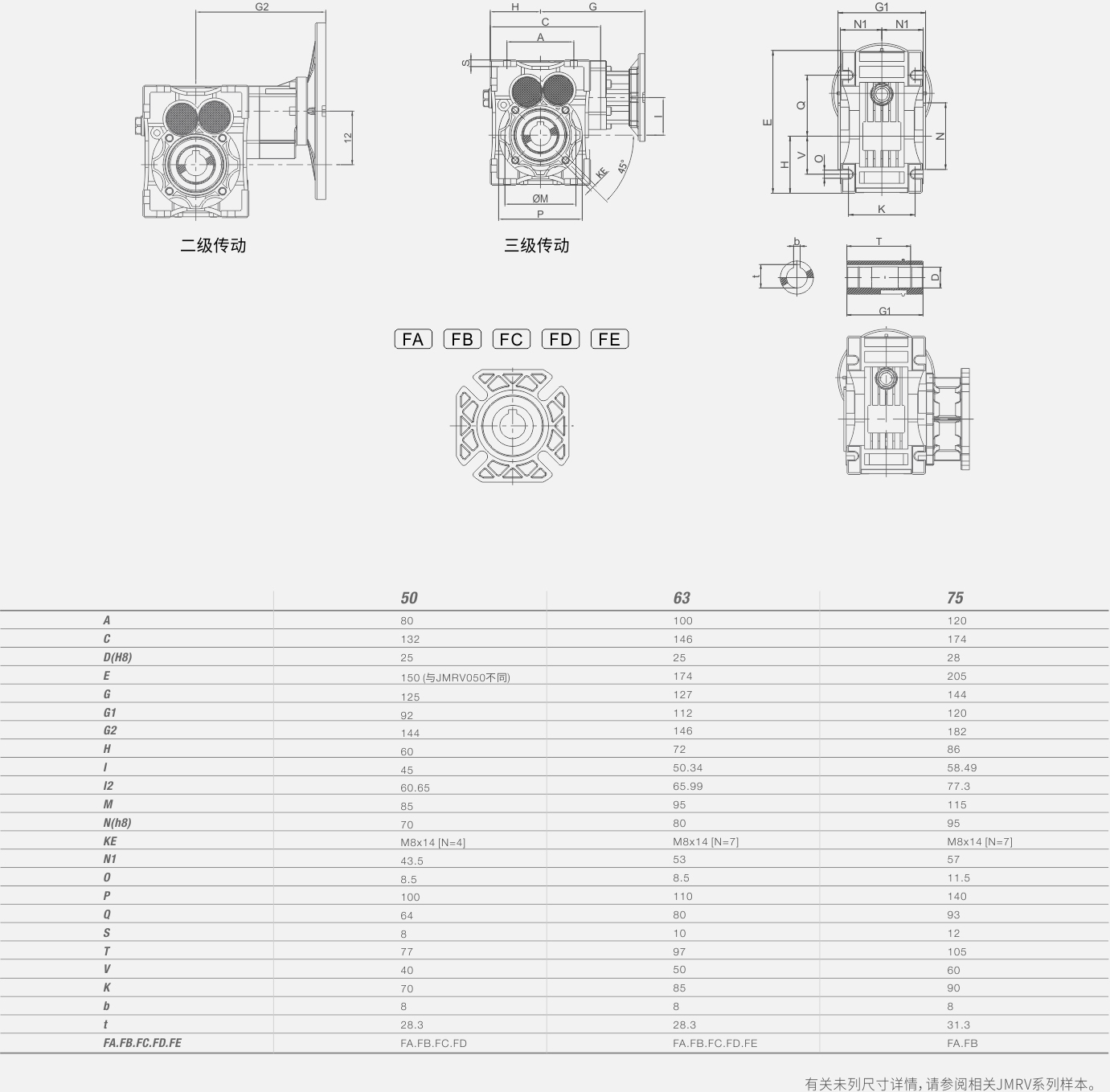 JHG系列減速器有50-63-75三種規(guī)格。速比7.5~60采用二級(jí)傳動(dòng),速比80~300采用三級(jí)傳動(dòng)。